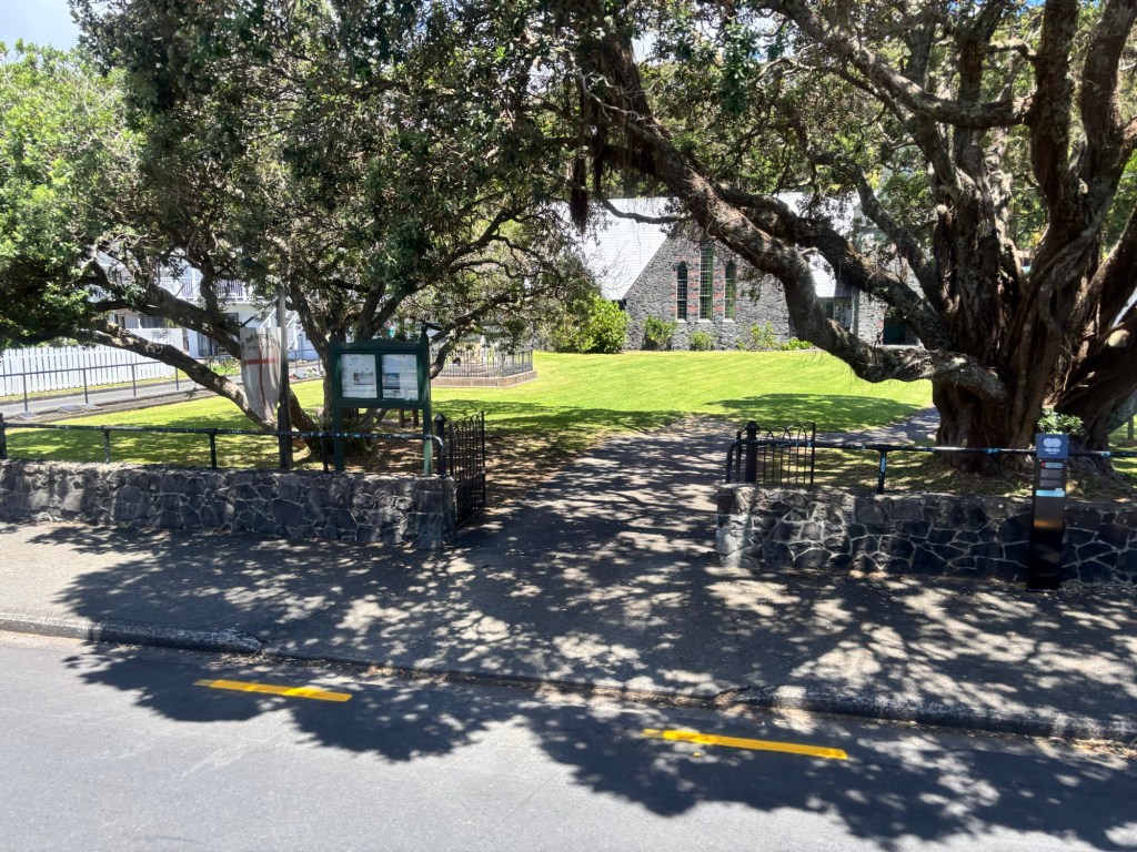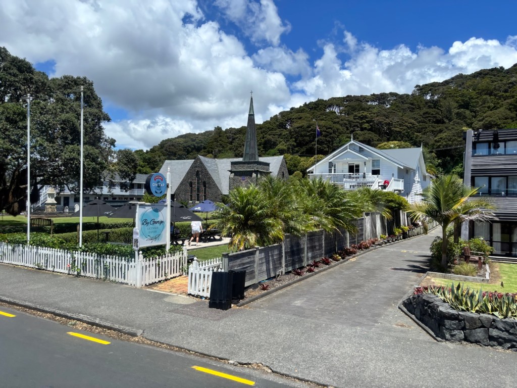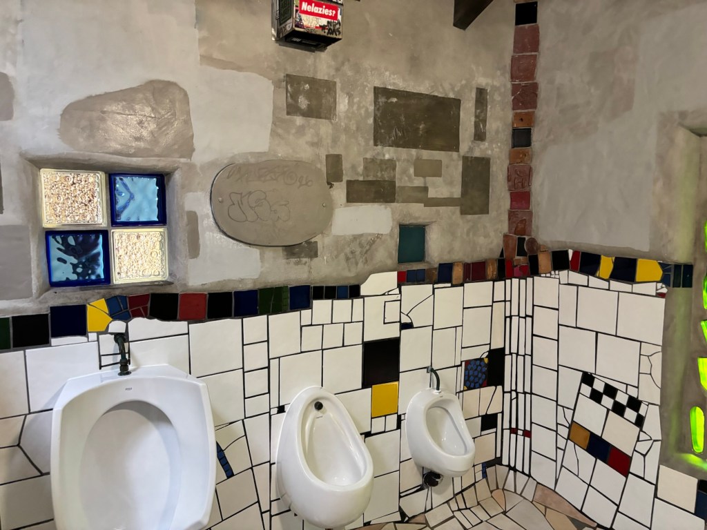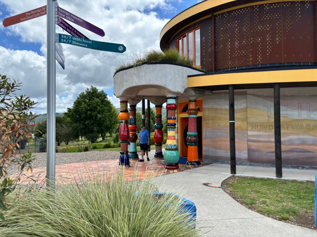 Our exploration of the area was by coach tour. Paihei was the community nearest the wharf. Very high end lodging and restaurants. Venturing inland via a highway originally built by the US Army during WWII, we came to Kawakawa. This is more of a blue-collar community with a unique claim to fame. An Austrian architect (Hundertwasser) decided the town could use a public restroom facility that is bizarre to say the least. It sort of reminded me of Antonio Gaudi’s style in Barcelona.