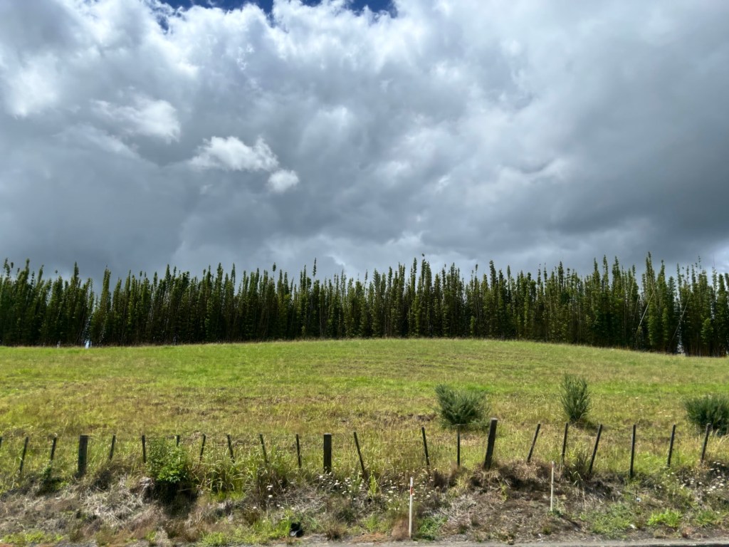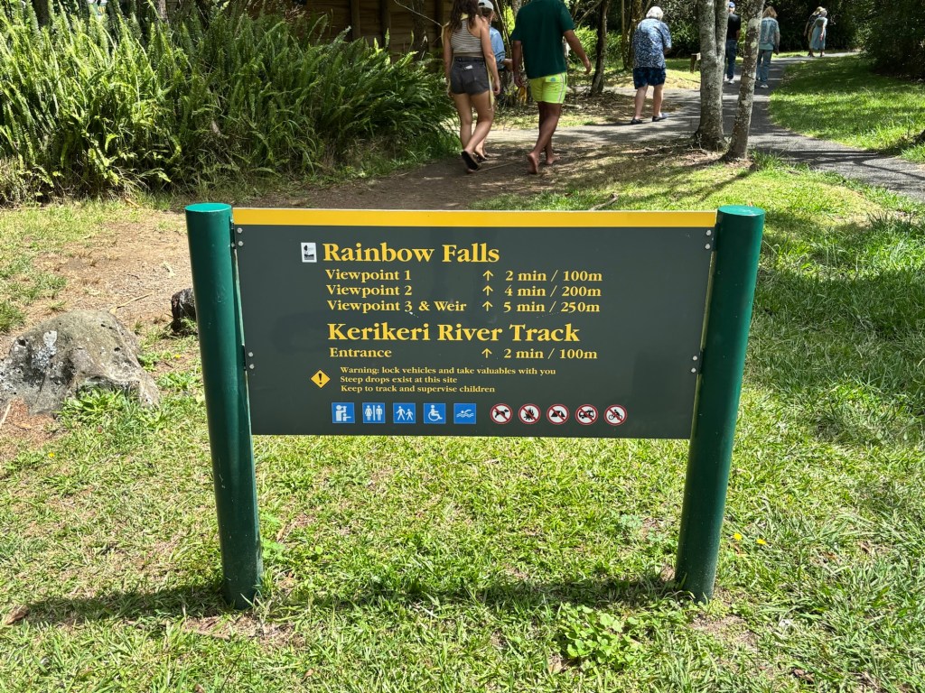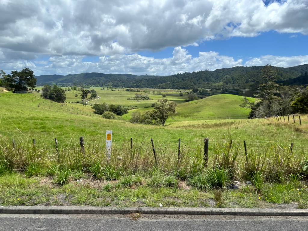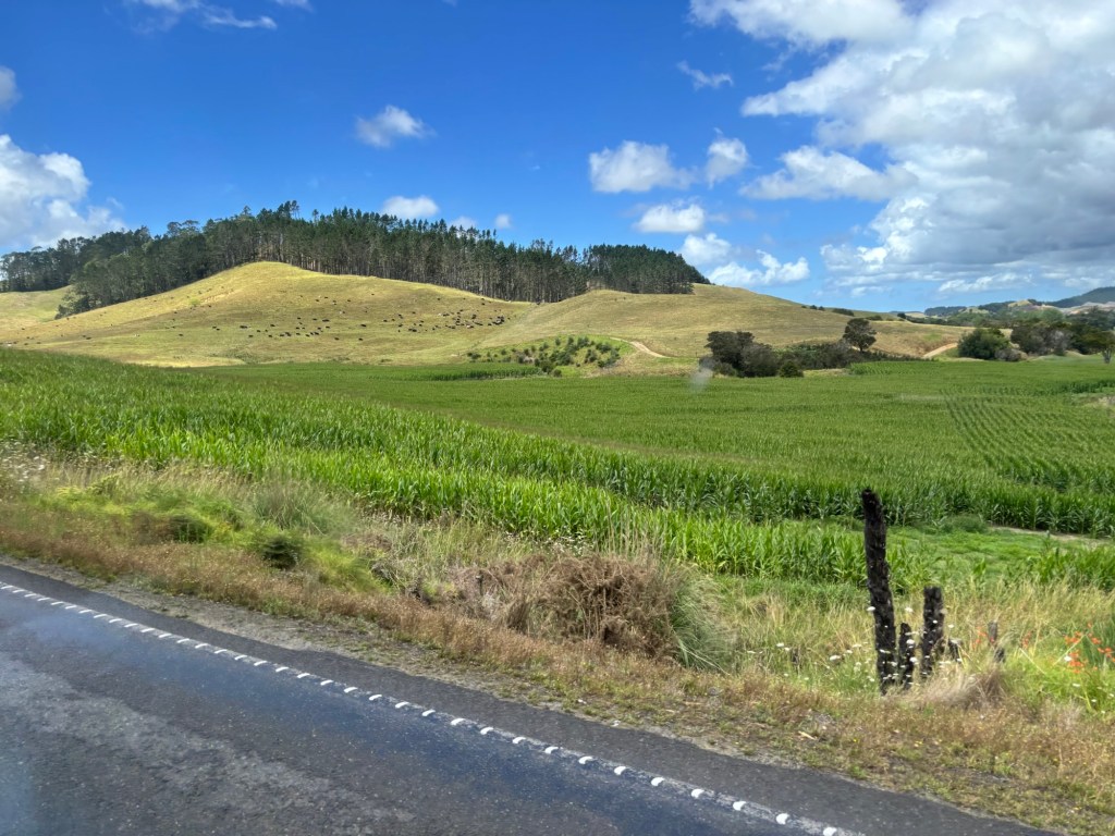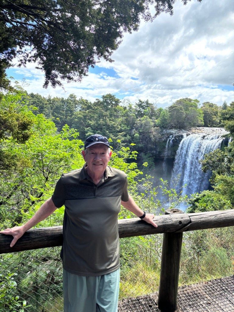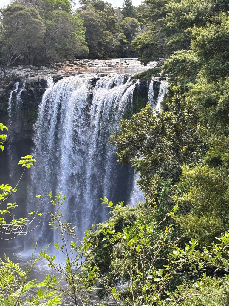 We traveled on through several kilometers of lovely farm and grazing land before reaching Rainbow Falls. Our driver/guide filled us in on the agricultural bounty of the North Island: dairy, kiwi fruit, avocado, manuka honey, citrus, timber and wool. He added that the sheep:human ratio has declined considerably over the last 40 years. It has gone from 20:1 to 8:1.