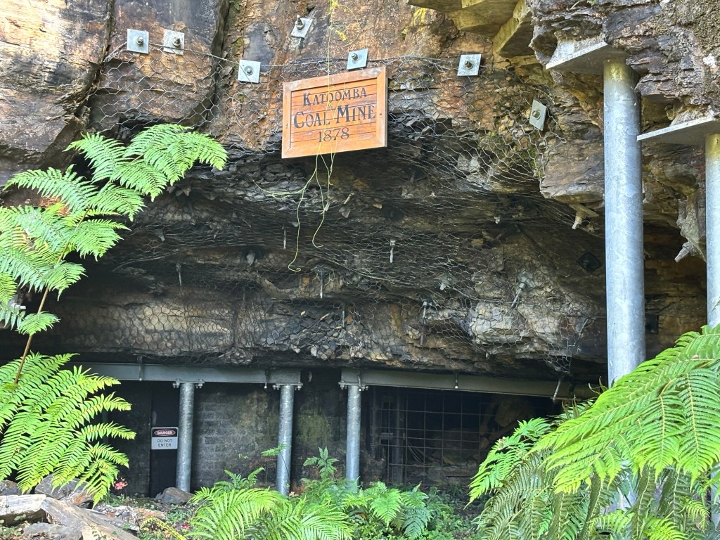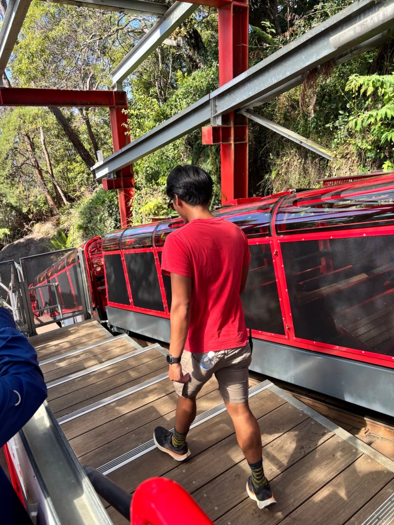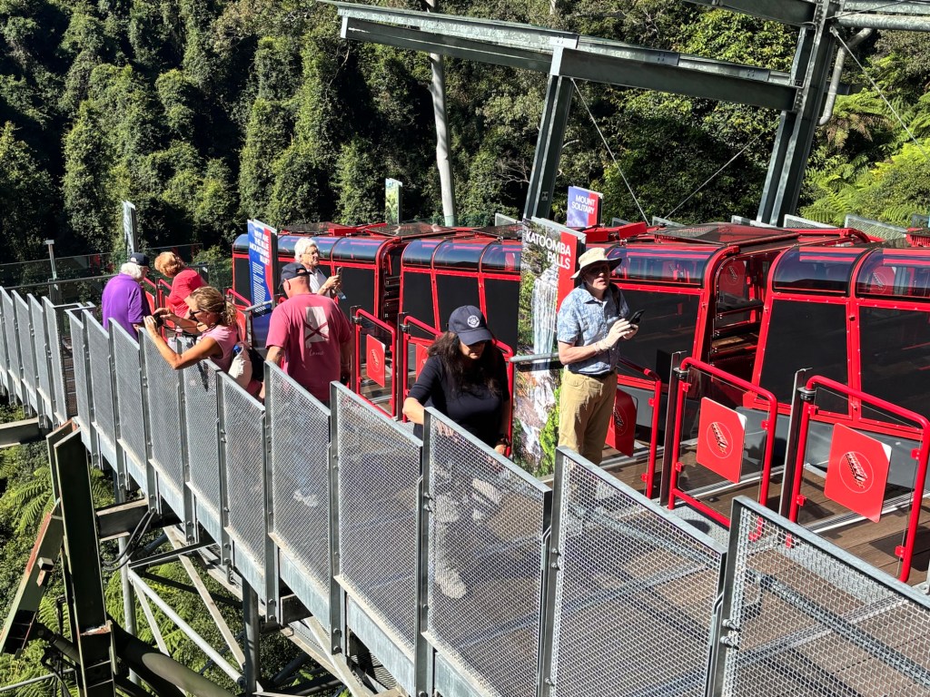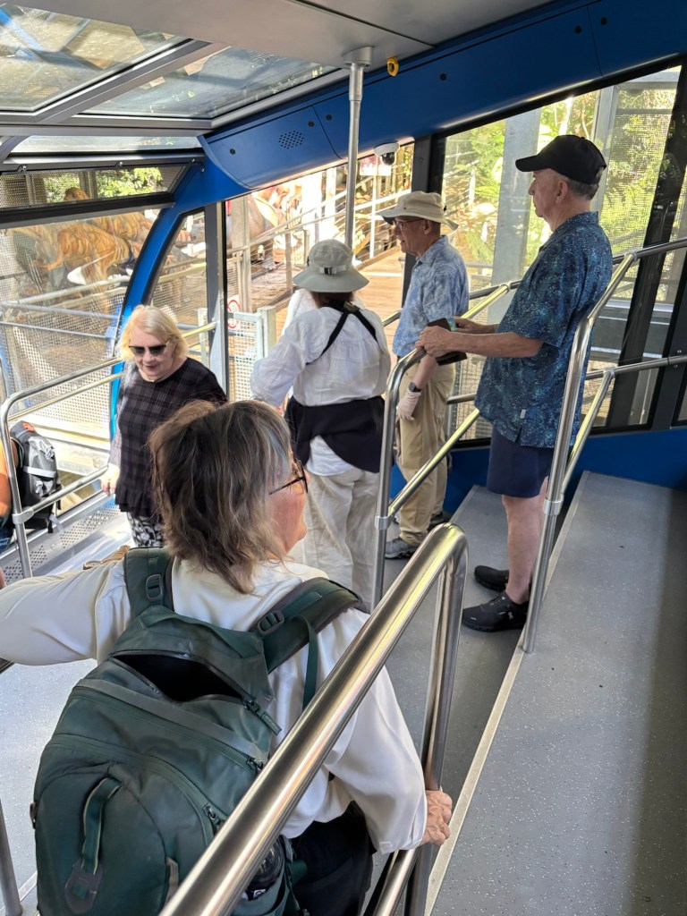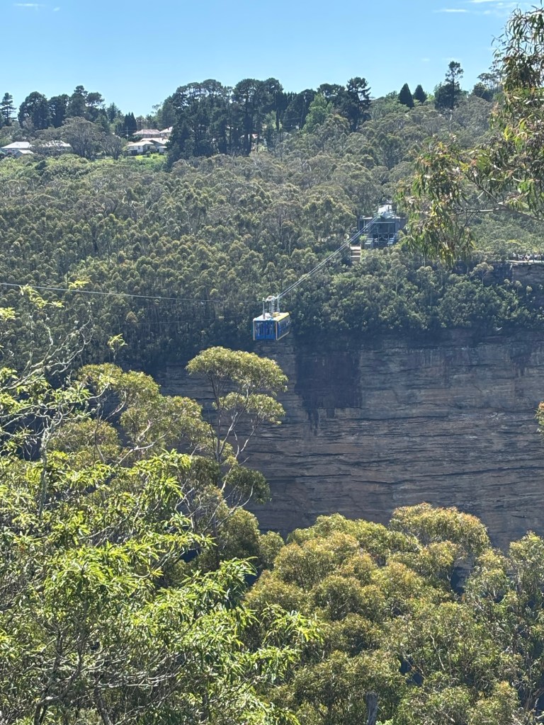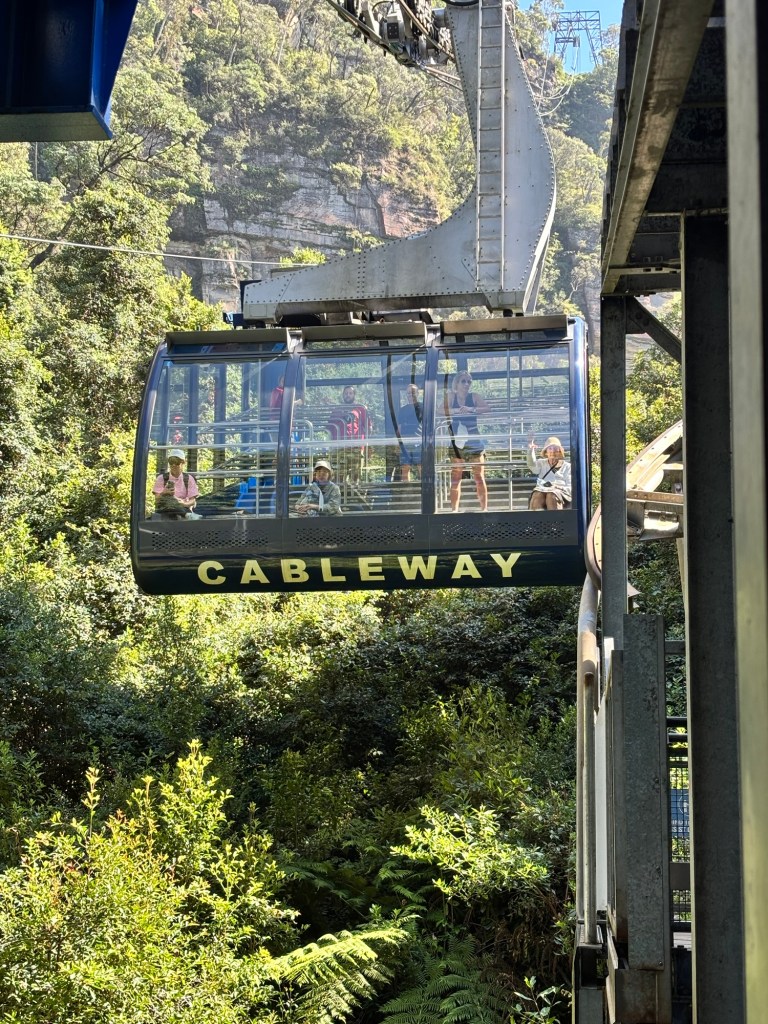 Today our tour group got an early start for the Blue Mountains, about two hours drive west of Sydney. Our destination was Scenic World in Katoomba. The venue was once a coal mine in the late 19th century. Today it is a modern attraction with multiple options for viewing the Blue Mountains and the Jamison Valley. We started with the Railway, a very steep set of 4 passenger compartments in which you could adjust the pitch of the car as you descended into the valley. At the bottom, there is an elevated walkway that runs between the base of the Railway and the base of the Cableway.