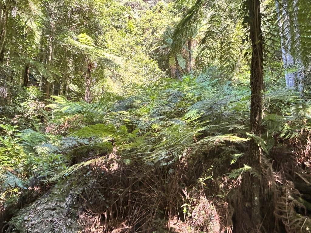 The walkway takes you past artifacts of the mine, but more interestingly runs thru what I would describe as a cool, primeval forest. Lots of huge boulders, ferns and dense eucalyptus. Upon returning to the main complex via the Cableway, we lined up for the Skyway. This is a super-sized gondola that runs a short distance to a scenic lookout and the starting point for various trails around the park.