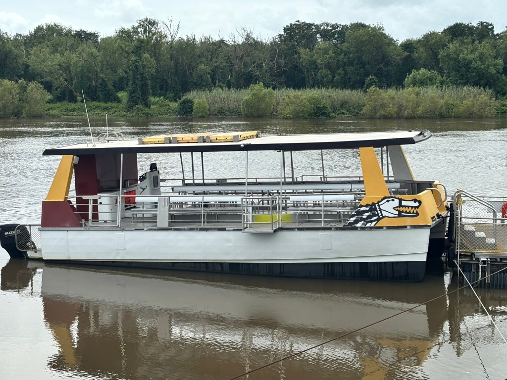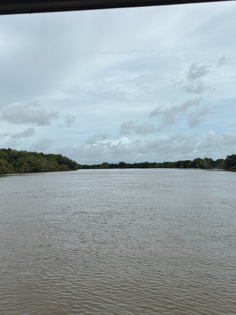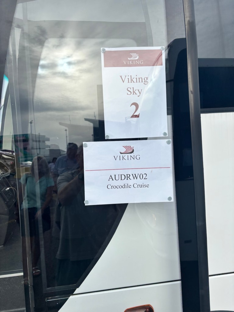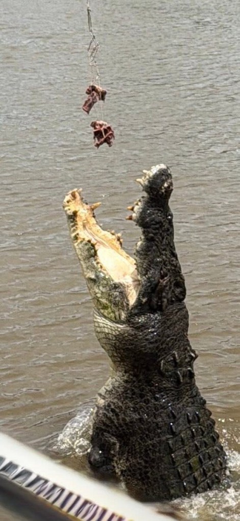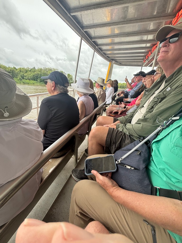 My activity today was a trip to the Adelaide River to see saltwater crocs, the largest living reptiles. The river destination was on land owned by the Larrakia people. The river cruiser held about 60 of us in four parallel bench seats. Our pilot did some pirouettes to make sure both sides saw the crocs as they swam near the boat. On some excursions, the crocs are fed by deckhands, but Viking prohibits that activity. So no giant crocs thrashing about trying to snatch raw chickens.