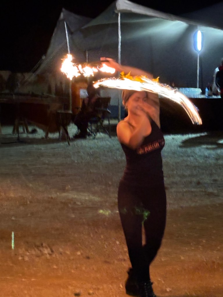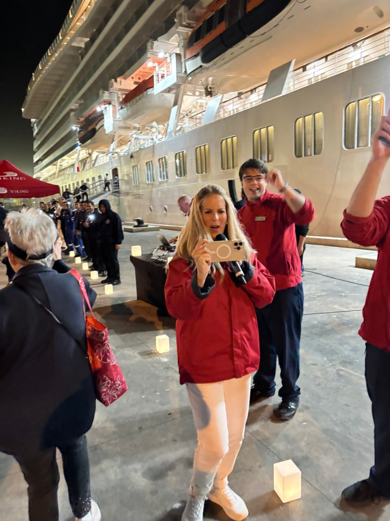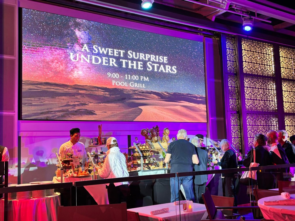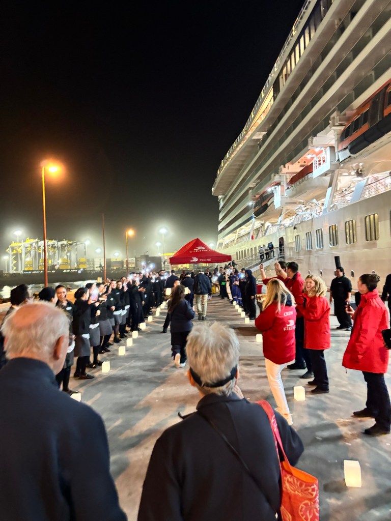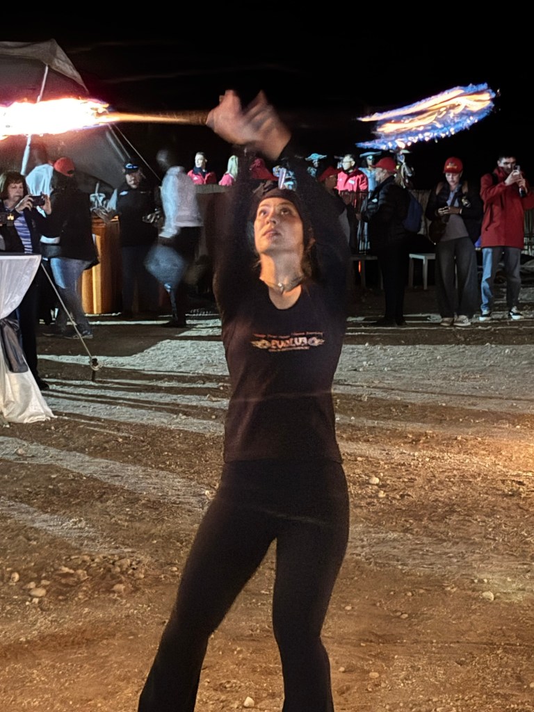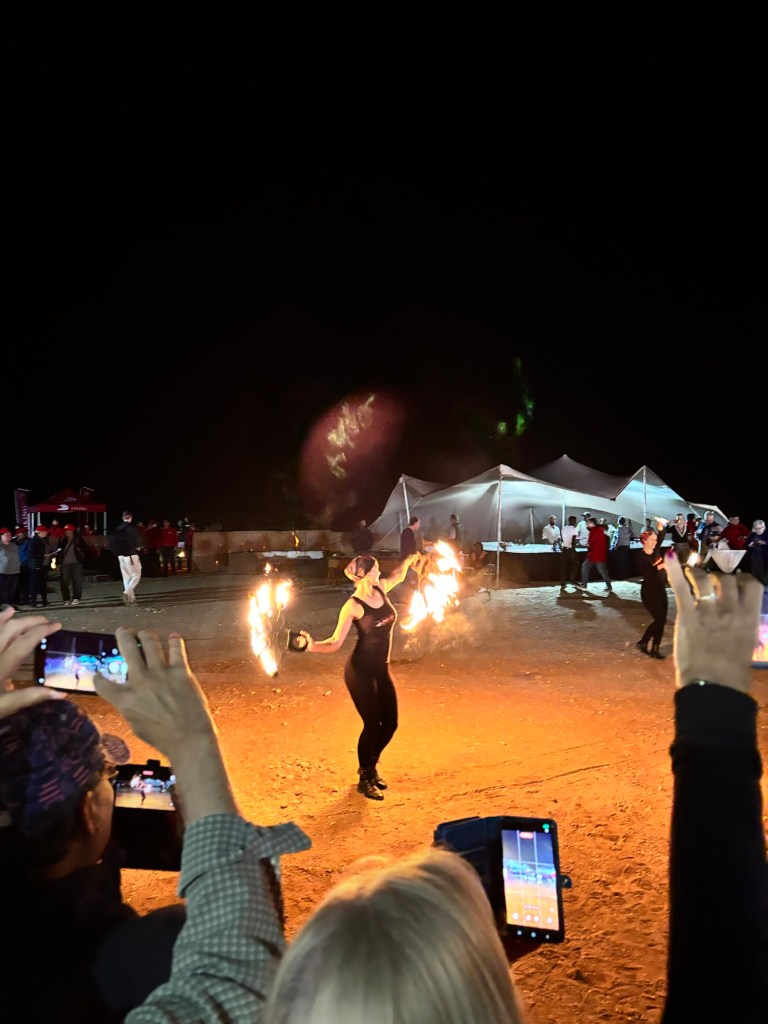 Viking invited us to a mystery location in the desert for an evening dinner under the stars. A convoy of coaches and mini-vans set out just before sunset. On arrival, we were greeted by a singing group in traditional garb and a field of luminaria. The venue was at the foot of a huge dune faintly illuminated by the setting sun. Servers greeted us with stems of sparkling wine as we oriented ourselves to the various buffet lines and large tents of banquet tables. After dinner, a quartet of fire dancers put on a lively show. Back at the ship, some of the crew welcomed us back to late night wine and cheese.