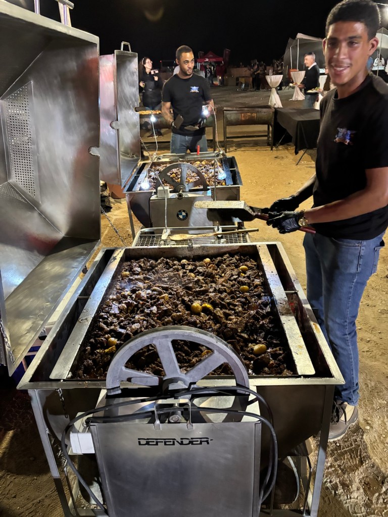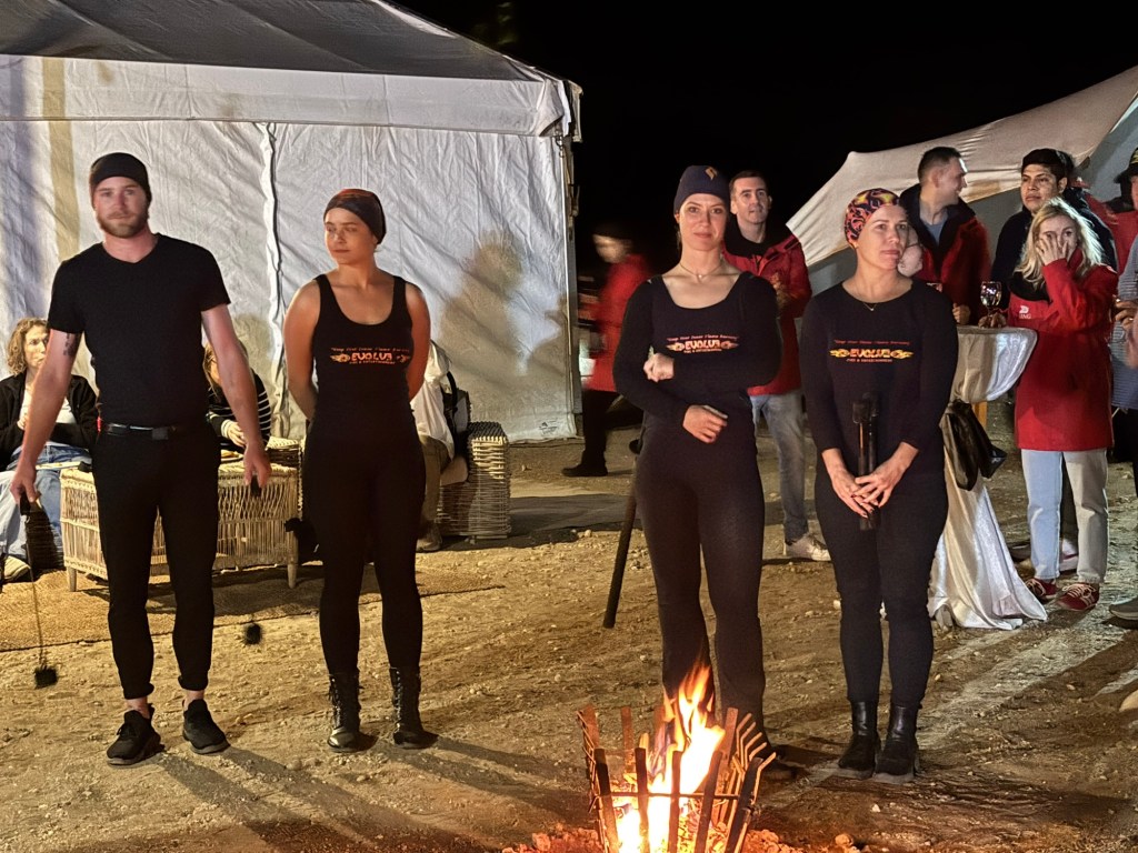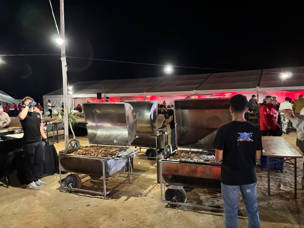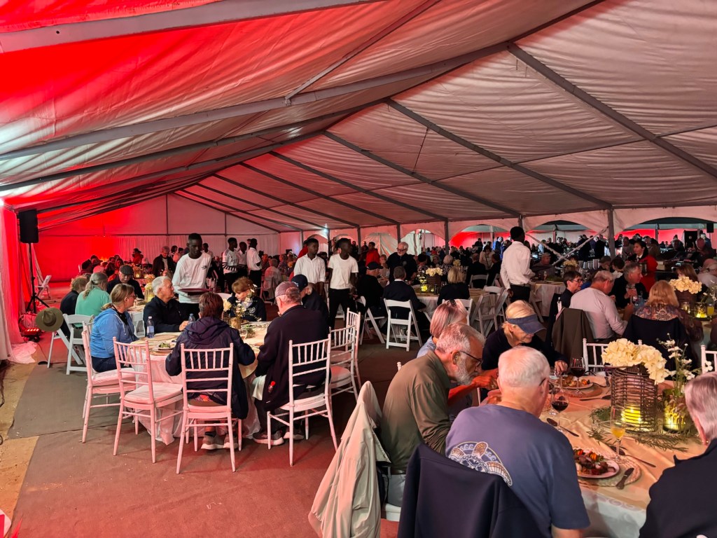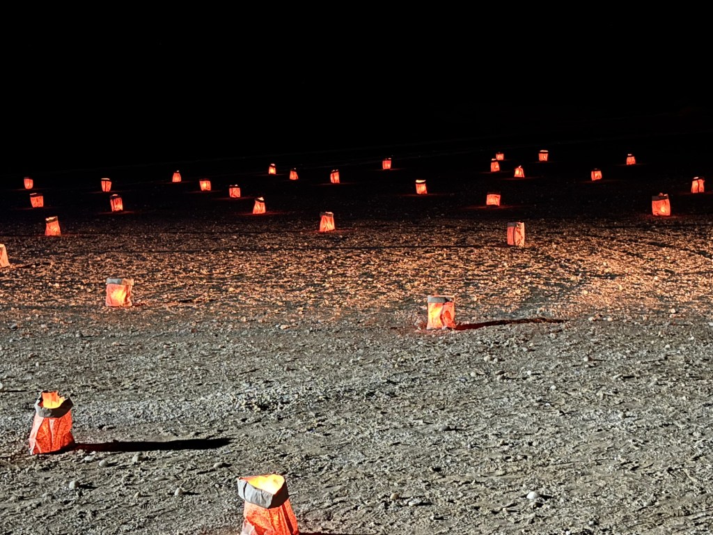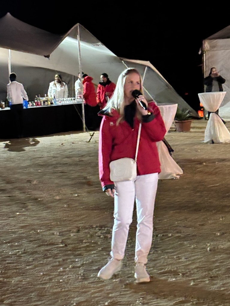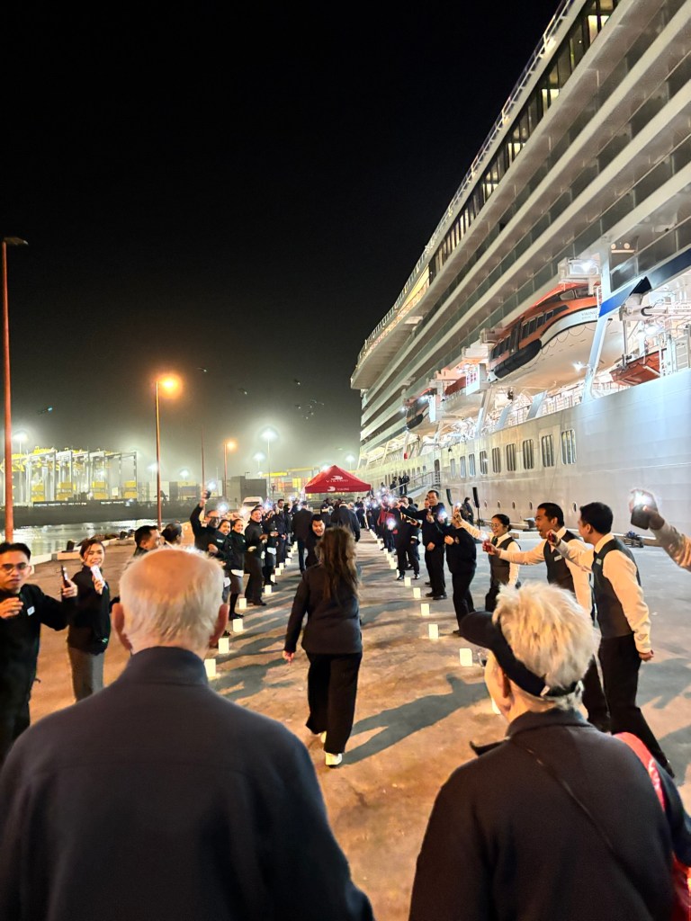 Viking invited us to a mystery location in the desert for an evening dinner under the stars. A convoy of coaches and mini-vans set out just before sunset. On arrival, we were greeted by a singing group in traditional garb and a field of luminaria. The venue was at the foot of a huge dune faintly illuminated by the setting sun. Servers greeted us with stems of sparkling wine as we oriented ourselves to the various buffet lines and large tents of banquet tables. After dinner, a quartet of fire dancers put on a lively show. Back at the ship, some of the crew welcomed us back to late night wine and cheese.