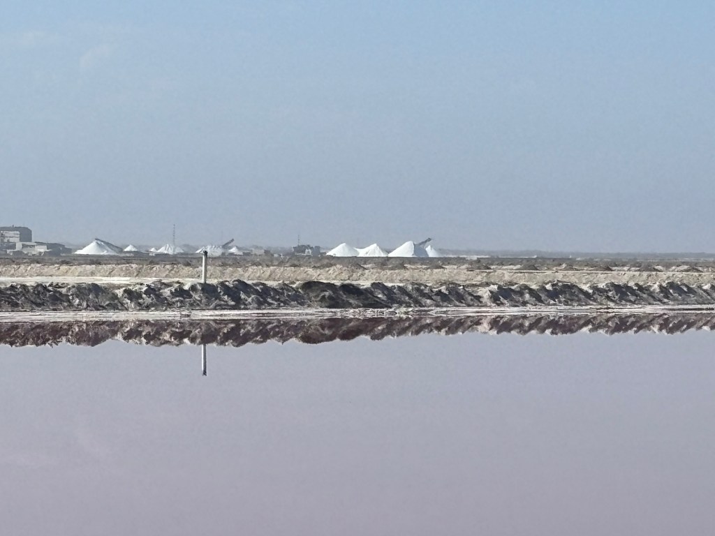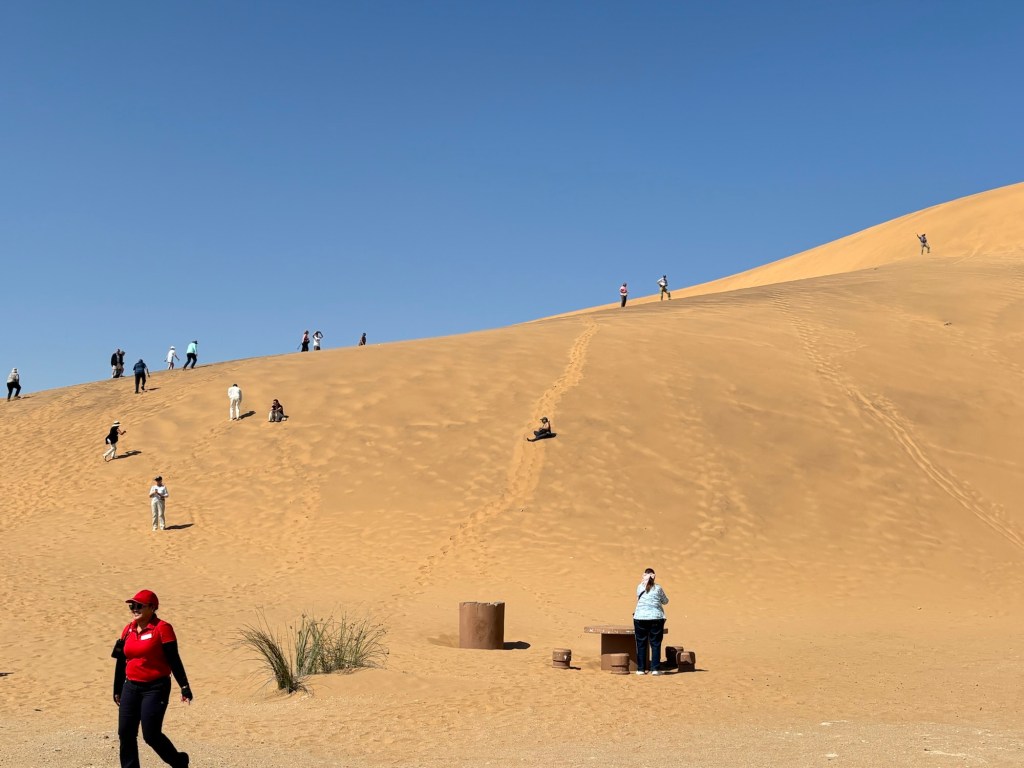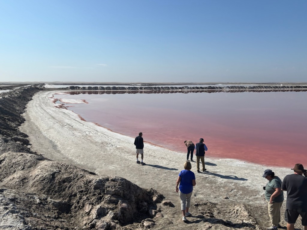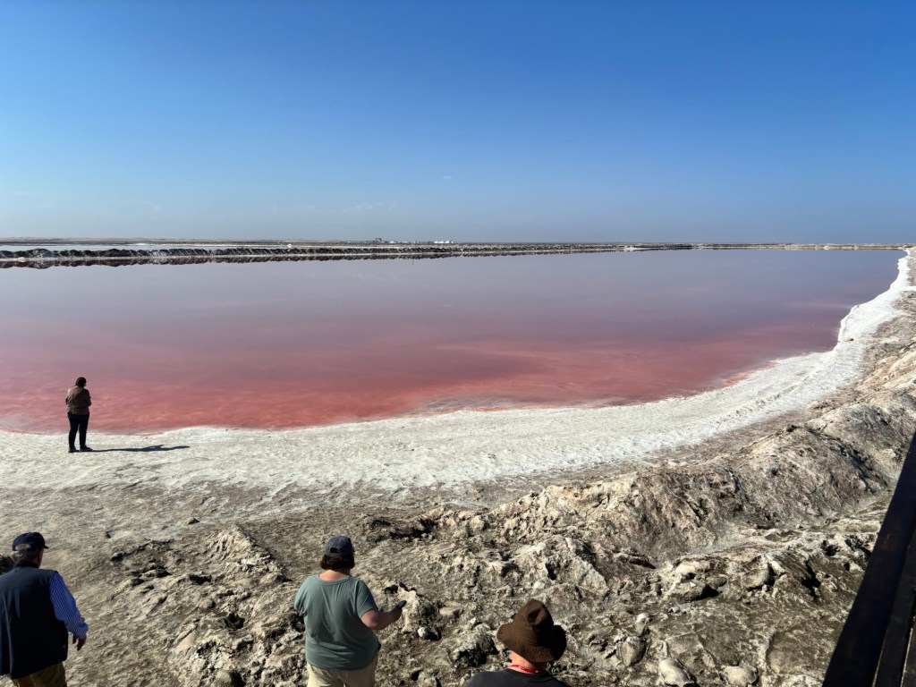 The following day began with a bird-watching excursion to a nearby lagoon. There we saw large numbers of flamingoes. The guide said something about greater and lesser flamingoes but that distinction was lost on me. From there, we visited a huge salt works which is a vast array of evaporation ponds. Crazy to think how a common mineral was once a precious commodity and currency. Finally, we drove back to the Namib dunes. As imposing as they were the previous night, they were even more impressive at midday.