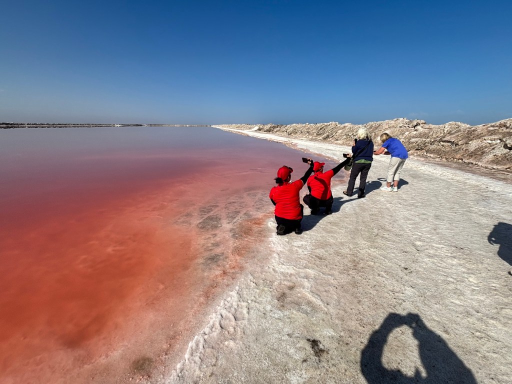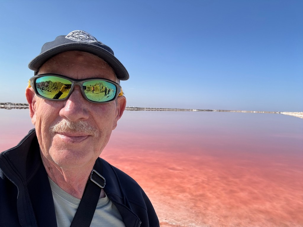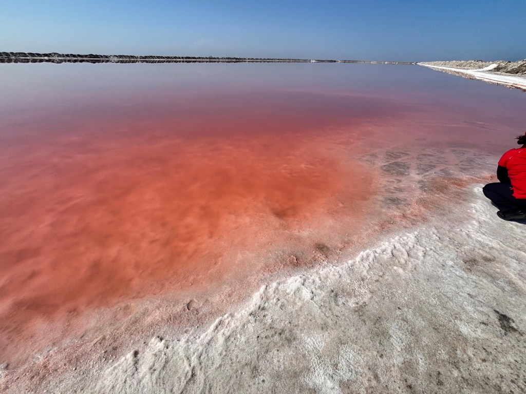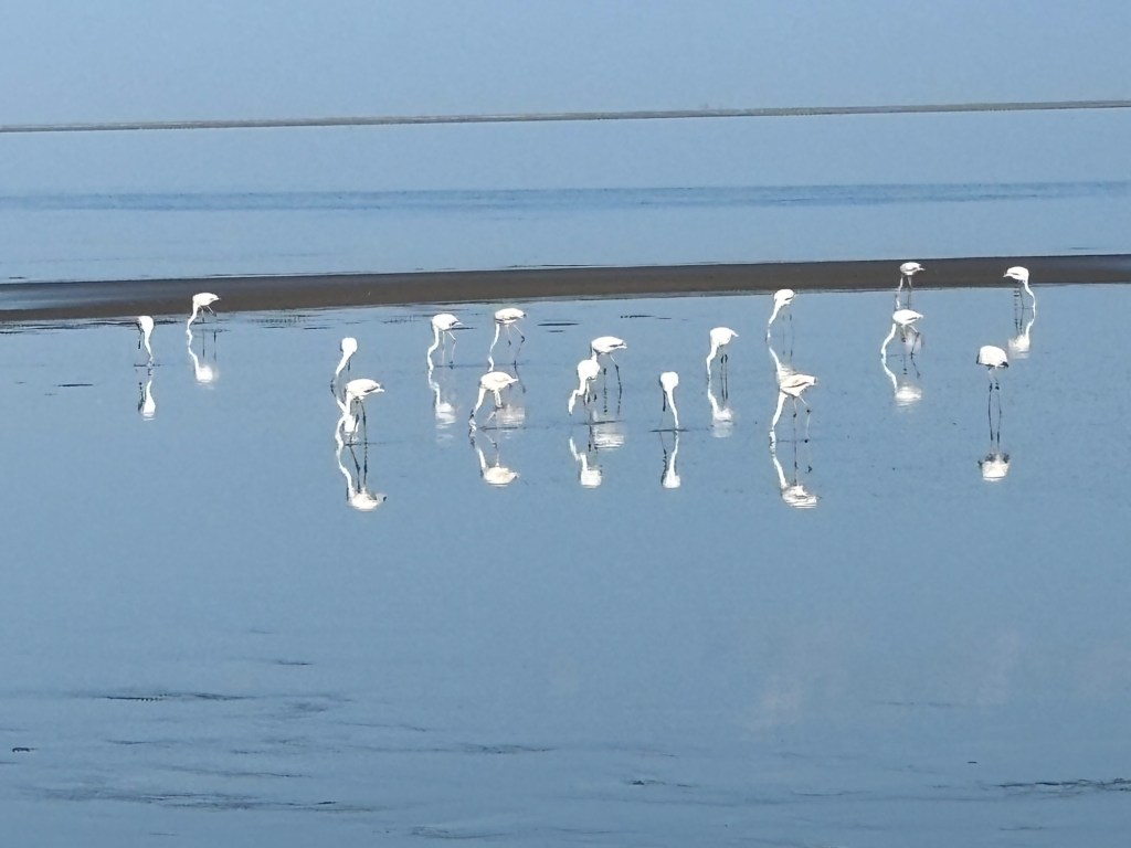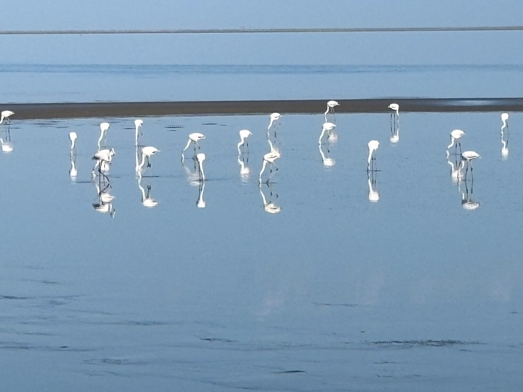 The following day began with a bird-watching excursion to a nearby lagoon. There we saw large numbers of flamingoes. The guide said something about greater and lesser flamingoes but that distinction was lost on me. From there, we visited a huge salt works which is a vast array of evaporation ponds. Crazy to think how a common mineral was once a precious commodity and currency. Finally, we drove back to the Namib dunes. As imposing as they were the previous night, they were even more impressive at midday.